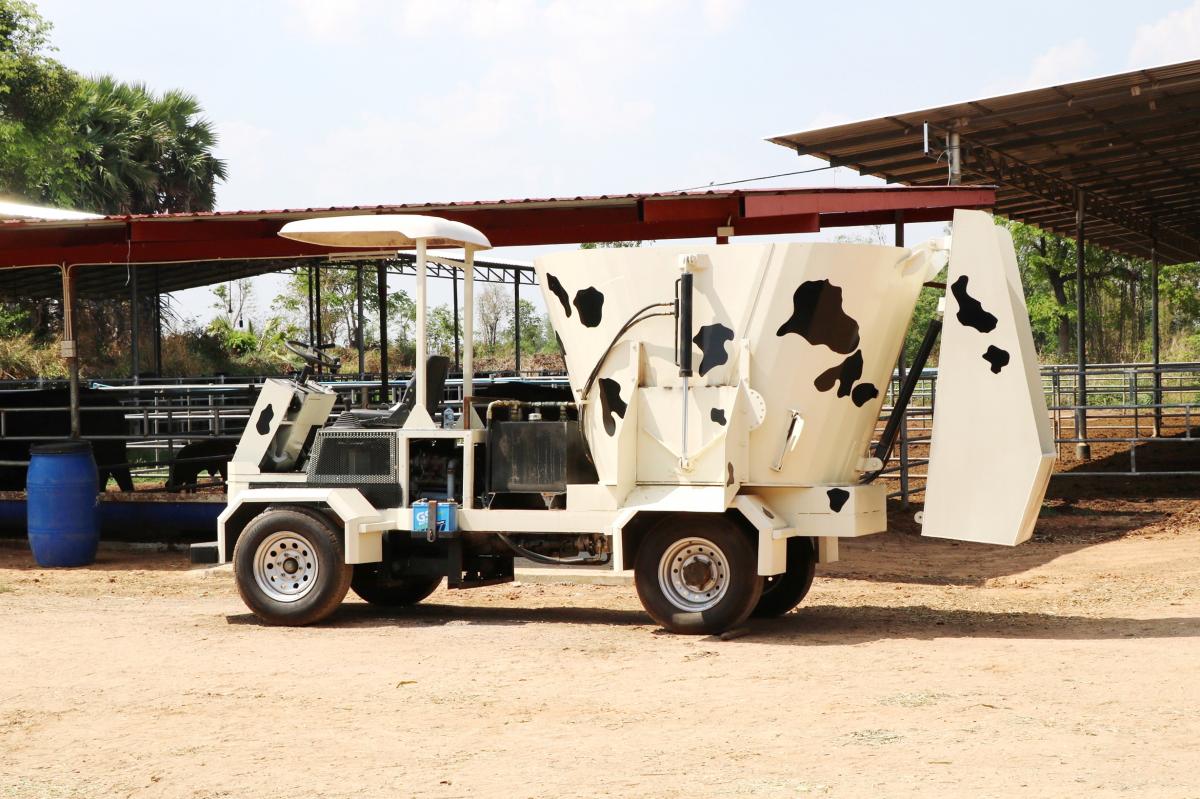 นายดุสิต ตั้งพิสิฐโยธิน นักวิจัย MTEC กล่าวรายละเอียดผลการดำเนินงาน โครงการรถผสมหญ้าอาหารสัตว์ เดิม ทีมผู้วิจัยมีแนวคิดในการใช้ระบบการผสม “แบบเกลียวแกนนอน” ในชื่อเครื่องผสมหญ้าอาหารสัตว์แบบแกนนอนคู่ เนื่องจากพบว่าในตลาดเครื่องผสมหญ้าหรือผสมฟางในกิจกรรมทางปศุสัตว์ ล้วนออกแบบเป็นแกนเดี่ยวแนวตั้งที่มีวัตถุประสงค์ในการสับและปั่นผสมในรูปแบบที่พบในเครื่องจักรผสมอาหารสัตว์แบบผสมรวม ที่มีชื่อเฉพาะว่า TMR หรือ Total Mix Ration ซึ่งทีมผู้วิจัยต้องการนำเสนอการพัฒนาผลงานที่แตกต่าง โดยเลือกระบบเกลียวผสมแบบแนวนอน และจำเป็นต้องเป็นแกนคู่ เพื่อทำหน้าที่เป็น screw mixer ไม่ใช่เพื่อ screw feeder ที่ทางเทคนิคสามารถช่วยประหยัดระยะเวลาในการผสมได้สั้นลง กำหนดระดับความหนืดของอาหารที่ต้องการผสมได้ เนื่องจากเหมาะสำหรับผสมได้ทั้งอาหารแห้งไปจนถึงในระดับที่มีความชื้นสูง ตอบสนองความต้องการของกิจกรรมทางปศุสัตว์ที่หลากหลาย แต่ในขั้นตอนการออกแบบและพัฒนาในเบื้องต้น เป็นการมุ่งไปที่กลุ่มเกษตรกรโคเนื้อที่มีการกำหนดสูตรอาหารในรูปแบบที่เหมาะสมสำหรับการผสมด้วยเครื่อง TMR มากที่สุด ในการออกแบบและพัฒนาแบบแกนนอนคู่ พบว่าไม่สอดคล้องความต้องการของคุณลักษณะอาหารสำหรับโคเนื้อ จึงปรับปรุงรูปแบบให้เป็นไปตามความต้องการของกลุ่มเป้าหมายมากขึ้น แต่ยังคงการเสริมกลไกที่มีความแปลกใหม่ เพื่อสร้างนวัตกรรมให้เกิดขึ้นในผลงาน จึงได้แนวทางการออกแบบเป็นเครื่องผสมหญ้าอาหารสัตว์ที่มีจุดเด่นและแตกต่างจากเครื่อง TMR ทั่วไป ด้วยการทำให้เป็นลักษณะ mobile unit และเงื่อนไขการทำงานที่สะดวกรวดเร็ว เป็นการเพิ่มประสิทธิภาพและพัฒนาวิธีการทำงานในฟาร์มโคเนื้อได้อย่างเป็นรูปธรรรม”